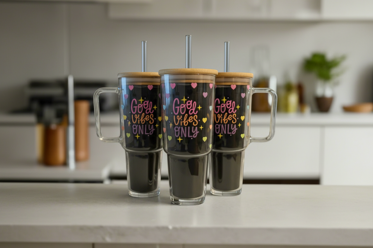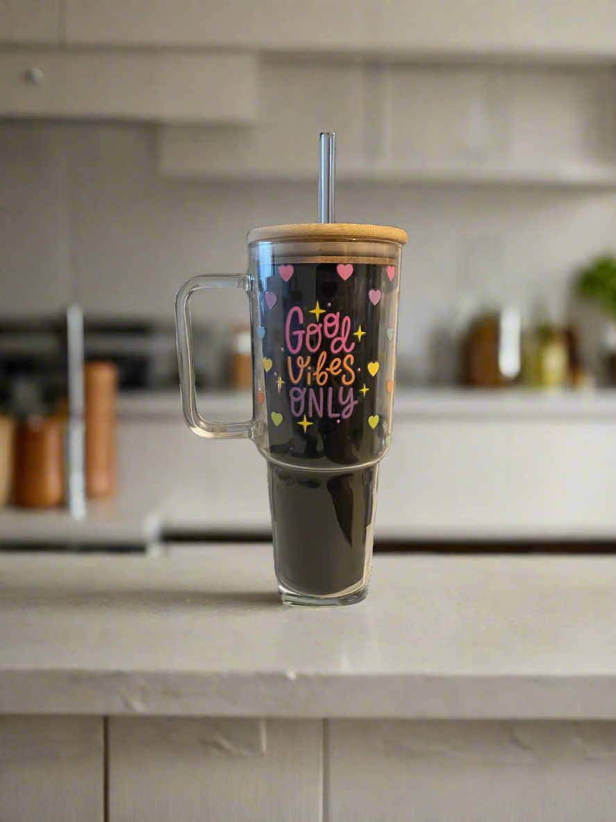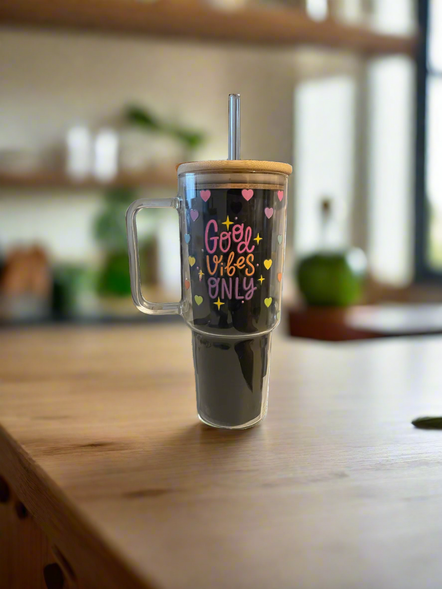 Sip in relaxing style with this Jumbo Glass Tumbler. This tumbler has a large handle shaped into the top and sports a satisfyingly clear body. A bamboo lid fits into the top that has a large straw through the center for easy sipping. Stay hydrated while you work at home or the office with the help of this fun and functional tumbler!